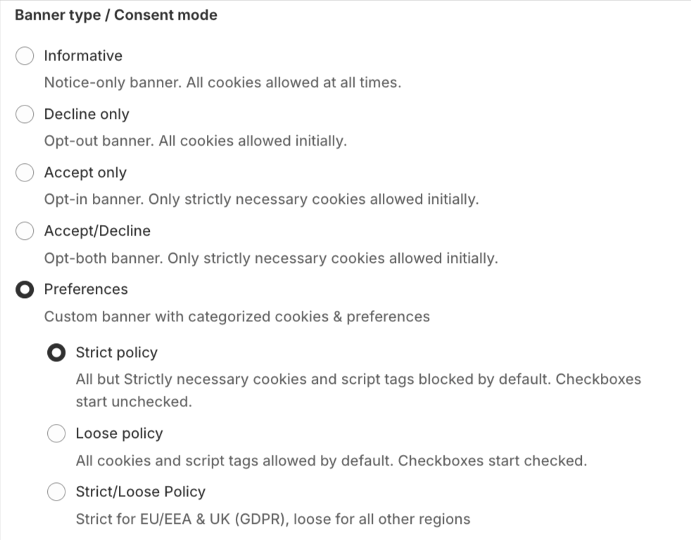 Customize your banner using UI options and custom CSS rules. Choose your banner type and the buttons. Decide on your banner logic. Determine who sees your cookie banner through reverse IP lookup for EU/CA/BR. Personalize the banner to your visitor’s language preferences with language identification