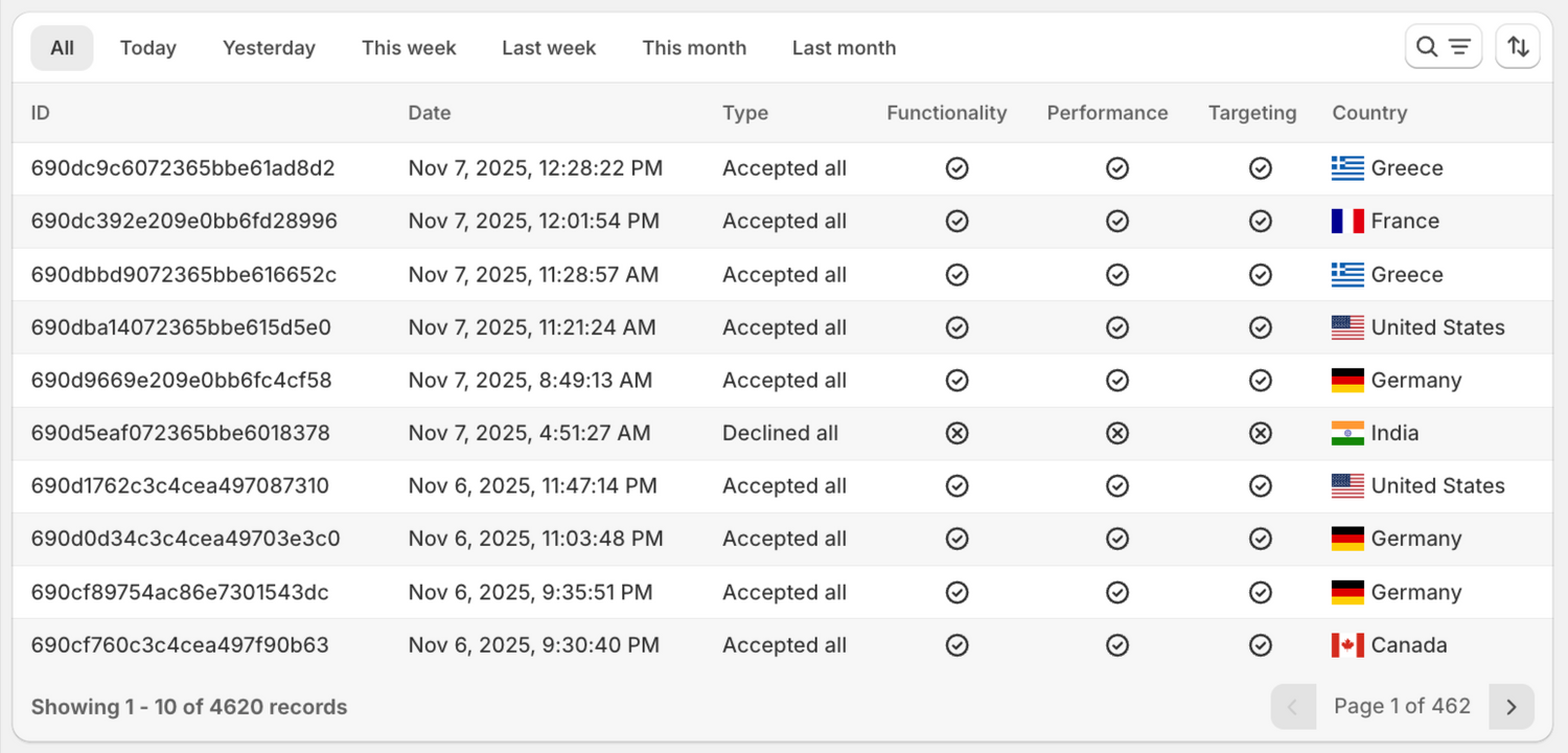 With our Audit & Compliance Report, you gain full visibility into your consent-management ecosystem. Instantly generate a detailed export of all banner interactions, cookies scanned, and data-subject requests, filtered by region, date and status. Use the downloadable report to demonstrate audit-ready compliance with GDPR, CCPA/CPRA, LGPD, and more, and keep your Shopify/Shopify Plus store protected and verified.