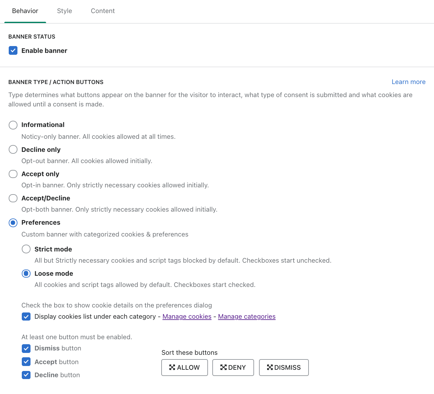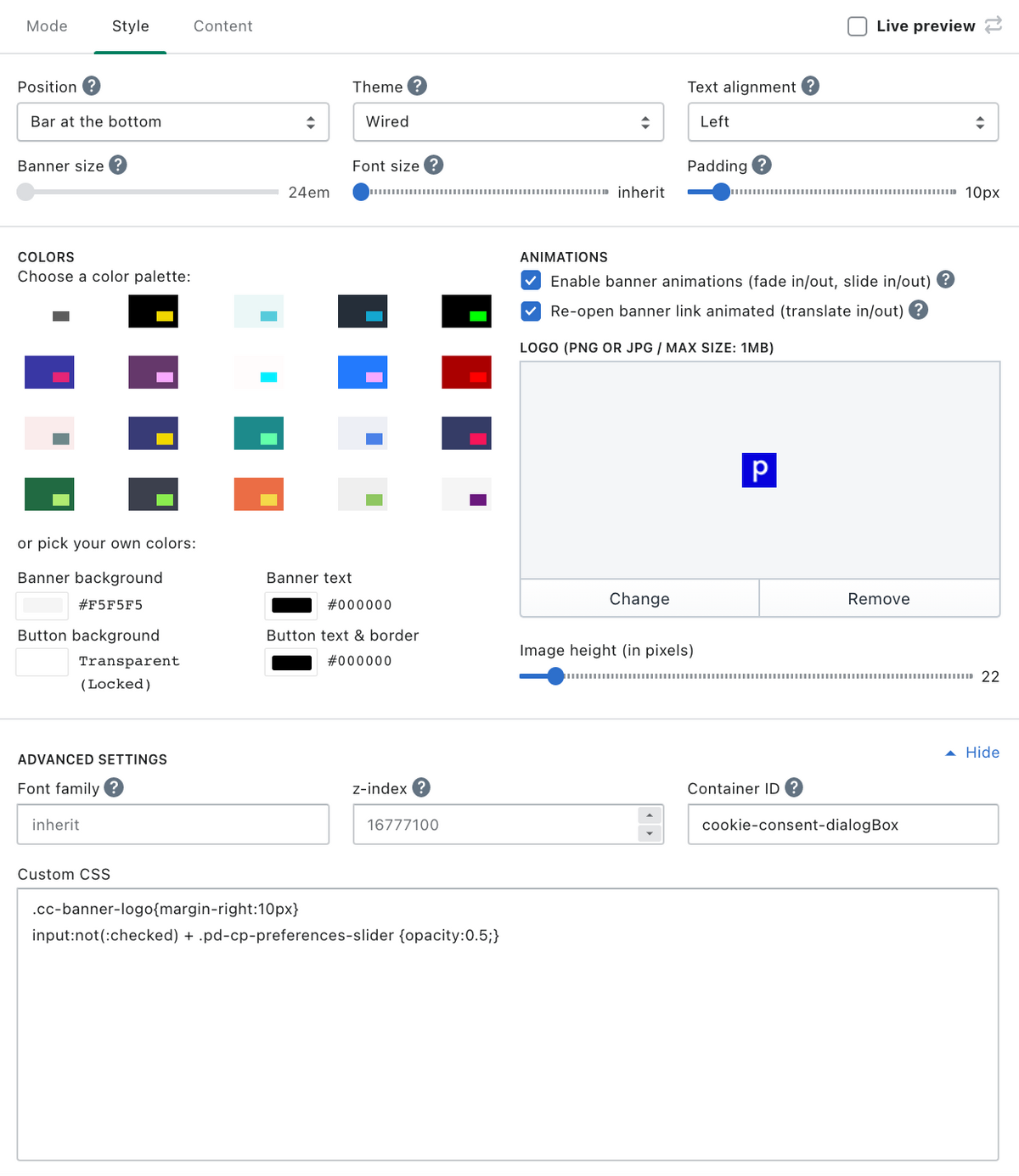 Customize your banner using UI options and custom CSS rules. Choose your banner type and the buttons. Decide on your banner logic. Determine who sees your cookie banner through reverse IP lookup for EU/CA/BR. Personalize the banner to your visitor’s language preferences with language identification