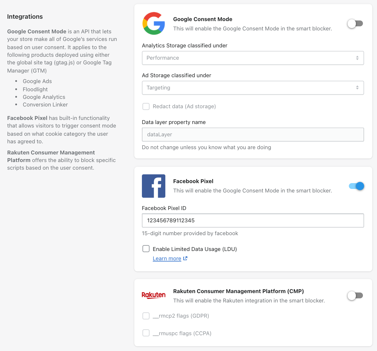 Make your store be compatible with Google, Facebook, Rakuten and Shopify about GDPR/CCPA compliancy without caring about the technical details.